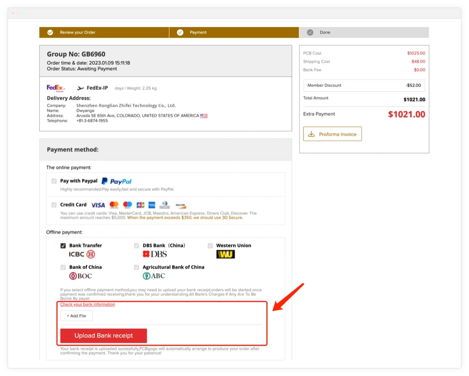 If you want to pay by bank transfer for your PCBgogo order, you can choose Wireless Transfer、DBS Bank(China) Ltd.、Western Union.、Bank of China、Agricultural Bank of China The detailed payment process is as follows: