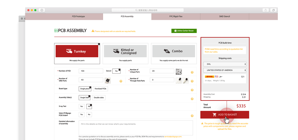 Thirdly, after you press “CALCULATE” button, the price will come out. But price is only for assembly and shipping freight, components cost is not included. So, if you need the complete quotation, you should write the email address and click” ADD TO BASKET” (If you are a new comer, you should register first, then log in.)